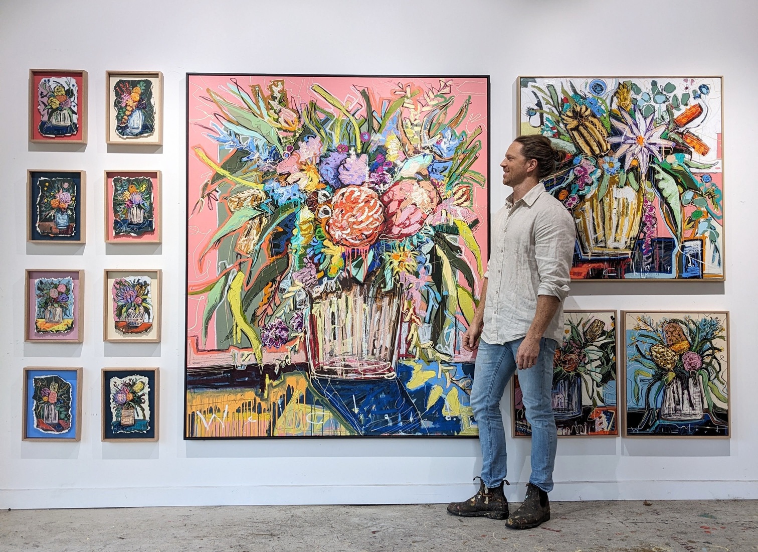 This one’s a little different. It’s a concept I’ve been quietly building in the background — something that merges my painting practice with a hands-on, design-driven process that felt totally fresh and creatively charged. At the heart of this series is a collection of small, native floral arrangements titled Flower Song, each painted onto hand-deckled matboard, mounted on colour-blocked timber, and finished with a handmade frame and non-reflective art glass. It’s a build-from-scratch concept that I dreamed up as a way to extend what I do on canvas — giving each piece structure, depth and texture while still keeping it true to my expressive, layered style. There are eight of these little beauties, along with a few larger canvas works in the mix, all featuring Australia’s most iconic native blooms. Honestly, I’ve never seen anything quite like it out there — and that’s what made it so exciting to create.