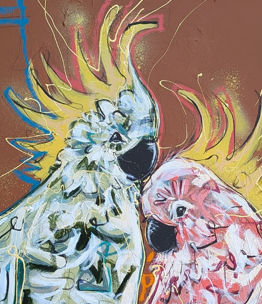 “Branch of Two” captures a moment I adore—two cockatoos perched close together, their crests brushing as if sharing a quiet secret. I’ve always been drawn to these birds: cheeky, social, and bursting with personality. Their playful energy mirrors the spontaneity I chase in my line work. In this piece, I let earthy browns anchor the scene while blue, orange, and soft beige lines weave movement and warmth through the composition. Cockatoos have long inspired me with their curiosity and their unmistakable Australian spirit. Painting them feels like painting home. Branch of Two is my tribute to companionship, wild joy, and those fleeting natural moments that make you pause—an artwork created to bring that same pause, and that same joy, into your space.